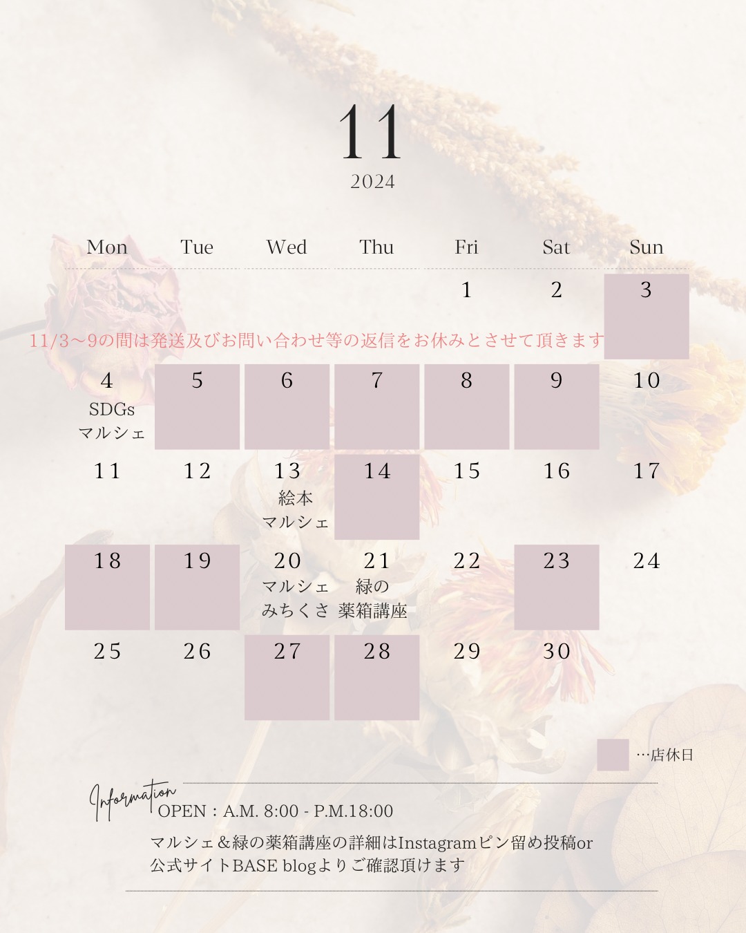 11/3〜9の間はイベント出店と店休の為、発送&お問い合わせの返答はお休みとさせて頂きます🌿